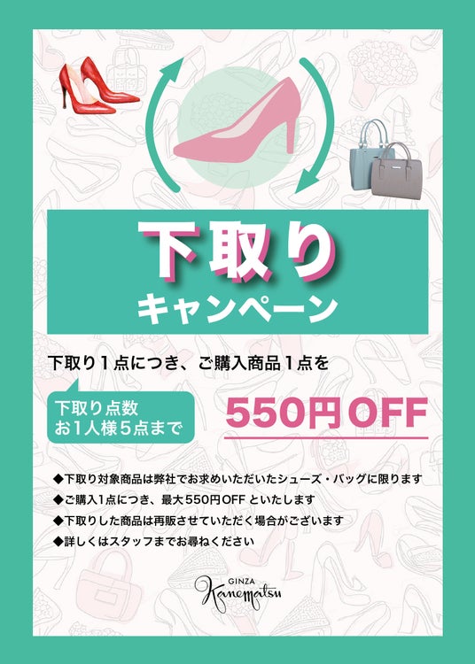 期間中、不要になった銀座かねまつのシューズまたはバッグを対象に、「下取りキャンペーン」を実施いたします。店舗にお持ちいただいた不要になったシューズ・バッグ1点につき、購入金額から550円をその場でお値引きいたします。回収させていただいたシューズ・バッグは、当社にて状態を丁寧に確認し、必要に応じてメンテナンスを施したうえで、再び誰かの手に届くリユース商品として販売する場合がございます。