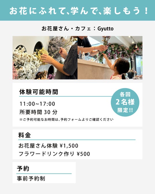 実際のお店で花束づくりや接客を体験。フラワードリンク作りにもチャレンジできます。