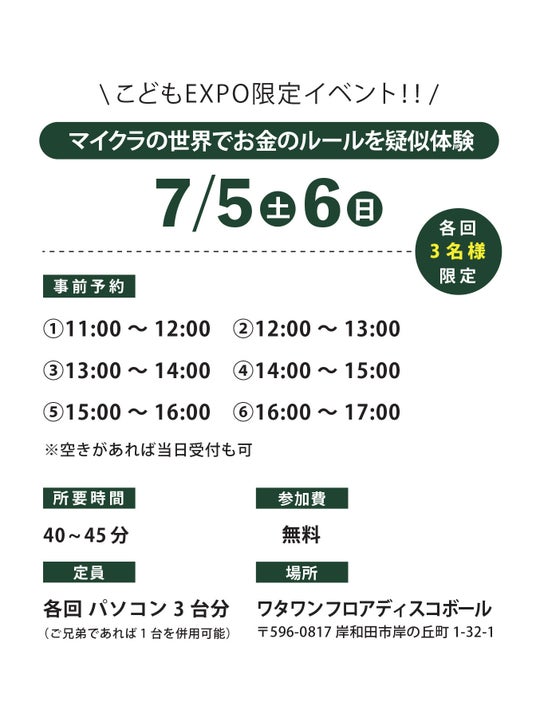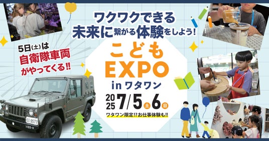 大阪・岸和田市のエンターテインメントモール「WHATAWON(ワタワン)」では、2025年7月5日(土)・6日(日)の2日間、子どもたちの「未来につながる体験」をテーマにした大型イベント『こどもEXPO in ワタワン』を開催します。本イベントでは、普段は入れない店員エリアでの接客体験やモノづくり、ワークショップ、自衛隊車両の展示など、子どもたちの好奇心を刺激し、学びと感動につながる多彩なプログラムをご用意。家族みんなで楽しめる特別な2日間に、ぜひご来場ください。