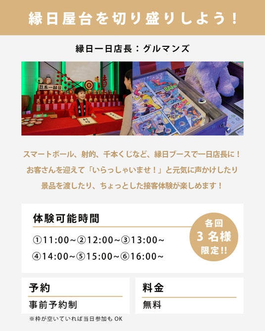 お客様を笑顔で迎えて接客に挑戦!景品渡しや呼び込みも体験できます。(無料/各回3名限定)
