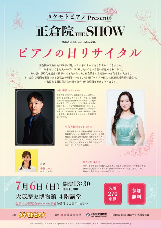 タケモトピアノ株式会社(所在地:大阪府堺市)は7月6日(日)「ピアノの日」を記念して、協賛する展覧会『正倉院THE SHOW』が行われている大阪歴史博物館の講堂にてピアノリサイタルを開催いたします。