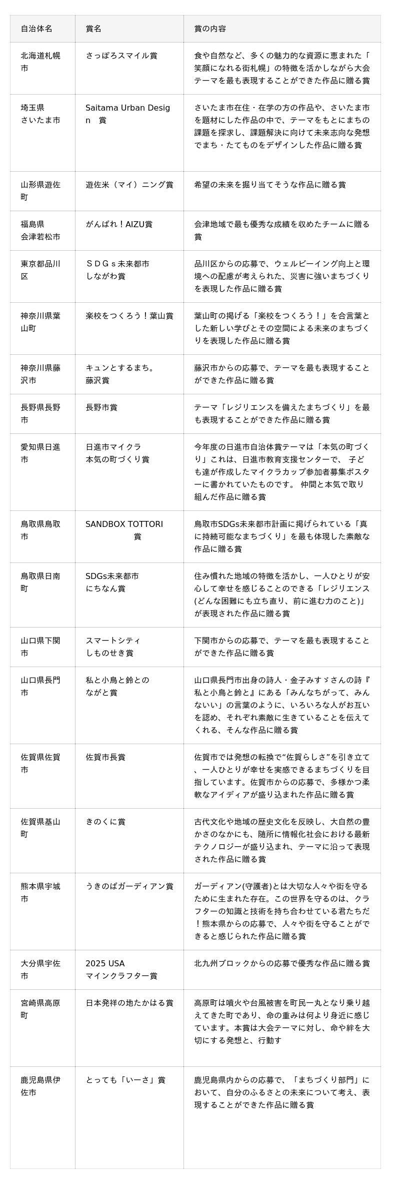 Minecraftカップでは、地域や環境格差によって子ども達がプログラミングやデジタルものづくり教育に触れられる機会を少なくしてはいけないという思いから、日本全国の自治体の方々と連携して、地域の子ども達に向けたデジタルものづくり教育の普及・推進に取り組んでいます。自治体独自に、教育版マインクラフトを使った学習やまちづくりをはじめ、大会参加を目指したワークショップや体験会を実施。また、各地域の教育委員会や学校に向けた広報協力や、まちづくり部門地区大会「特別賞」の授与を通じて地域の子ども達の挑戦を応援いただいています。2025年度のまちづくり部門地区大会は、11月1日から12月4日にかけて全国14ブロック(国内13、海外1)にて行います。