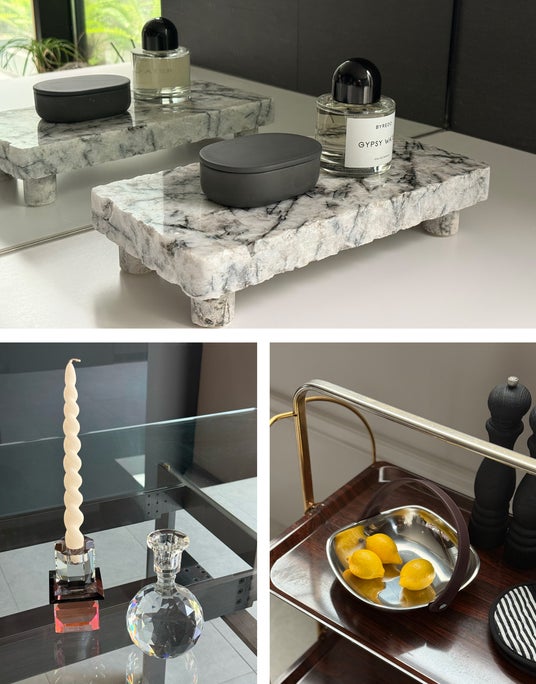 大理石をそのまま切り出したかのような重厚感のあるトレー。天然石の上質かつモダンな風合いとマッシブな質感が静かに主張します。トレーはインテリアにおいて小物を引き立てる"ステージ"のような存在。テーブルの隅に置いて、一輪挿しやキャンドルなどをあしらえば、空間にまとまりが出てワンランク上のコーディネートに。13,200円