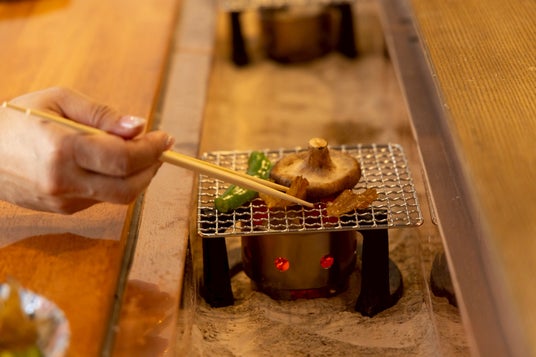 炭火が立ち上る音、食材が焼ける香ばしい匂い、料理人の所作──