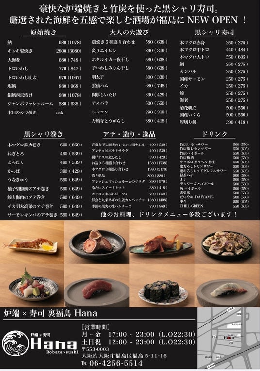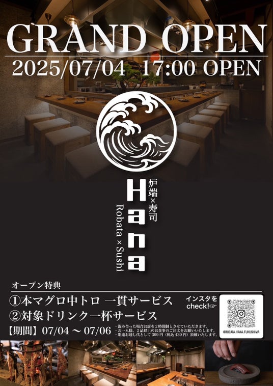 大阪福島に【炉端×寿司 Hana】7/4グランドオープン!!記念として2大特典をご用意7/4~7/6の期間1.本マグロ中トロ1貫無料 2.対象ドリンク1杯無料🍻