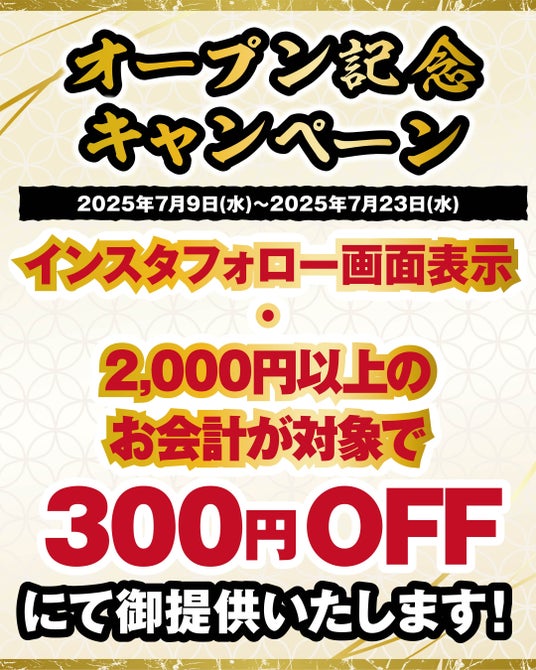 期間内「2000円以上のお会計」が対象で300円OFFでご提供致します。
