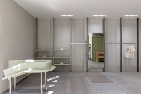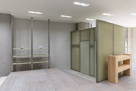 入口、フィッティングルーム、レジなど主要な動線ごとに段差を設け、空間の流れを強調する静かなリズムと重みを感じる空間となっています。