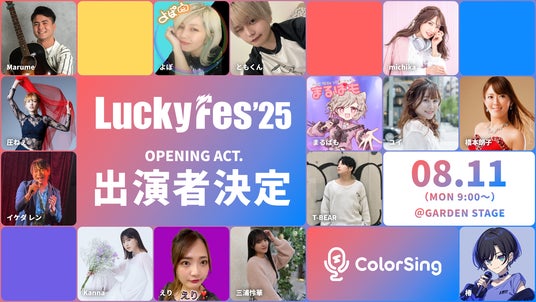 歌特化ライブ配信アプリ「ColorSing(カラーシング)」を運営するColorSing株式会社(東京都渋谷区、代表取締役社長 今井拓自、代表取締役会長 柴田順任 以下、当社)は、2025年8月9日(土)~8月11日(月・祝)に開催される音楽フェス「LuckyFes'25」のオープニングアクトとして出演するLシンガー(ColorSingでの配信者)14名が決定したことをお知らせいたします。