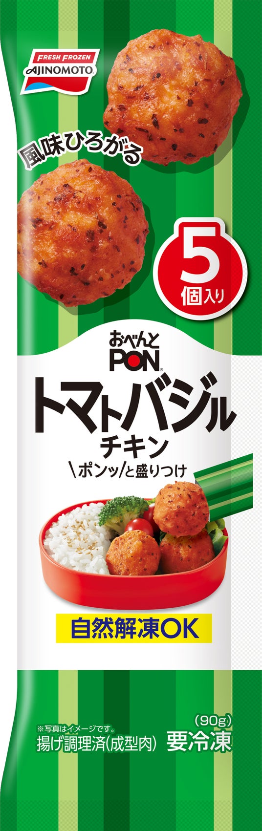 このたび、この「おべんとPON(R)」に新たに<トマトバジルチキン>が仲間入りしました。トマトとバジルの風味が広がる洋風な味付けに仕上げています。「おべんとPON(R)」はシリーズ全6品種の品ぞろえで展開します。