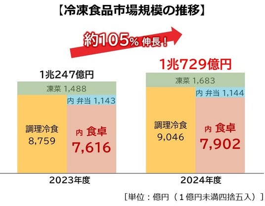 2024年度の冷凍食品市場規模は1兆729億円で、前年同期比で約105%と伸長しており、年々拡大しています。特に市場の約74%を占める食卓品は前年同期より約286億円拡大し、市場をけん引しています※。