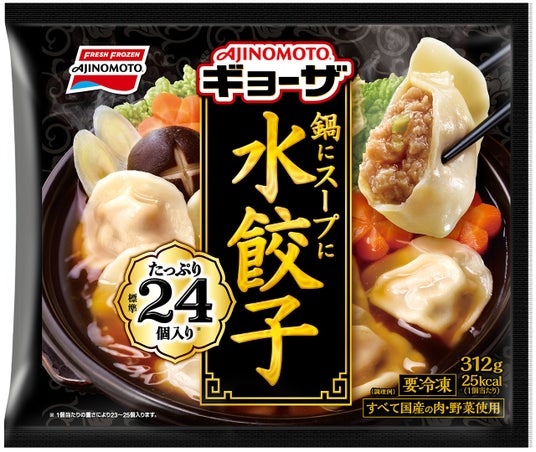 冷凍水餃子は、鍋やスープメニューに使用されており、年間購入金額の構成比を見るとミドル層とヘビー層が約76%※1を占め、ミドル層以上へのアプローチと使用頻度向上が市場拡大の肝になっています。そのような中、一般的な水餃子は1袋当たり15~16個入りで、1食当たりの喫食個数が少ないと感じている人が多いことがわかりました。そこで、鍋の具材が足りなくなった時や、スープがマンネリ化した時に、気兼ねなくたっぷり使うことができる<鍋にスープに水餃子>(1袋当たり標準24個入り※2)を新発売します。もちもちとした皮を採用し、皮の厚さと具材の量をバランスよく仕上げました。煮溶けにくい皮なので、鍋やスープに最適です。