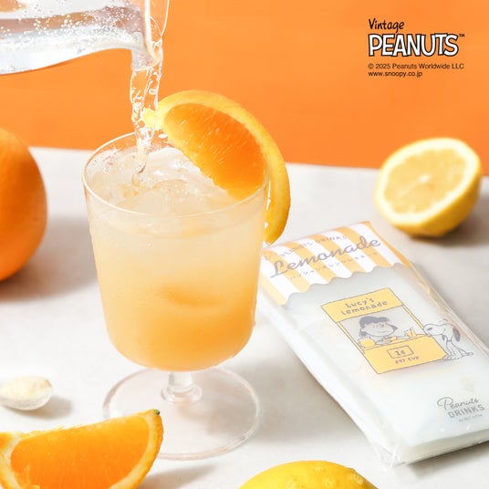 「PEANUTS DRINKS」の第三弾として、作品で親しまれアメリカの文化の象徴でもあるレモネードを作り上げました。いずれも本物の果汁をパウダーにしてブレンドしているため、自然な甘さでお子様も安心して楽しめる味わいとなっています。