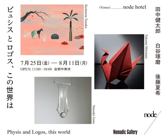 株式会社TRIAD(本社:東京都、代表取締役:倉持 正之、以下:TRIAD)が京都に保有する"アートコレクターの住まい"をコンセプトにしたnode hotel (ノードホテル / 所在地:京都市中京区四条西洞院上ル蟷螂山町461(運営会社:株式会社CANATA)) の1Fのギャラリースペースで、田中健太郎、白谷琢磨、後藤夏希による3人展「ピュシスとロゴス、この世界は」を開催いたします。2025年7月25日(金)から2025年8月11日(月祝)の期間開催され、出品作品は全て購入が可能です。関西では展示機会が少なかった作家3名による展覧会をお楽しみください。