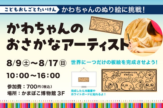 かわちゃんが描くおさかなイラストを焼き印した、かまぼこ板のぬりえができるワークショップです。デザインは全部で5種類。紙のぬりえとは違う塗り心地はまさに新体験です。完成した板絵はマグネットとして冷蔵庫やホワイトボードなどに貼ることができます。世界に一つだけの板絵づくりは、夏休みの思い出づくりとしてもおすすめです。