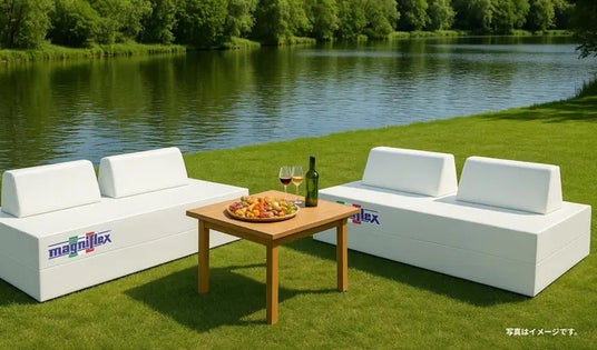 日本初登場、VIPブース用「アウトドアマットレス」本フェスのVIPブースにおいては、マニフレックスが日本初登場となる特別仕様のアウトドアマットレスを提供いたします。これは、屋外での上質なリラクゼーション体験を叶えるために開発されたもので、ソファと融合した新しい寛ぎのスタイルを演出します。 まるで自宅でくつろぐかのような心地よさを、海風が心地よく吹き抜けるシーサイドの非日常空間で体感していただけます。