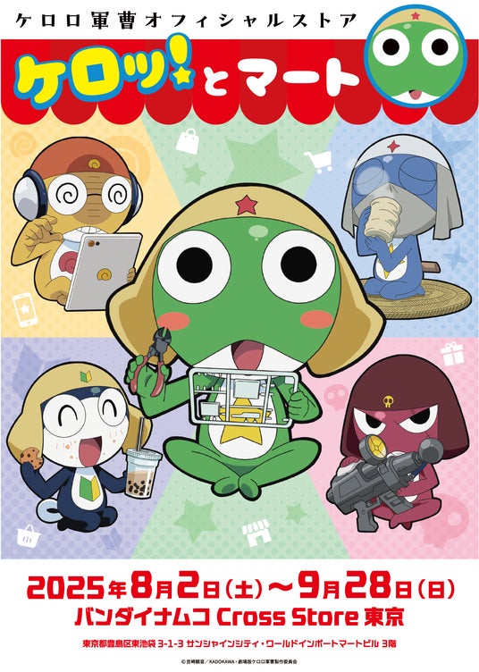 株式会社バンダイナムコピクチャーズは、株式会社バンダイナムコミュージックライブ、株式会社KADOKAWAと企画運営を行う「ケロロファンクラブ」協力のもと、2025年8月2日(土)から9月28日(日)にかけて、アニメ『ケロロ軍曹』のオフィシャルストア「ケロッ!とマート」を池袋・サンシャインシティ内「バンダイナムコ Cross Store 東京」に期間限定オープンいたします。