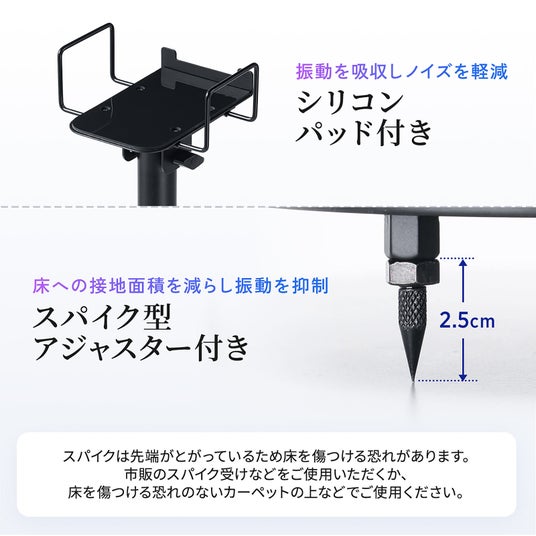 ・スパイク型アジャスターで振動を抑え、クリアな音を届ける