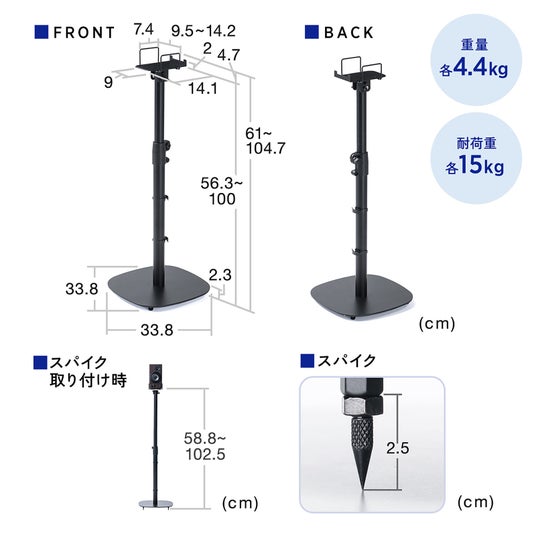 スピーカースタンド フロアー用 小型スピーカー向け 2本セット 高さ56~100cm 対応サイズ14×14cm スパイク型アジャスター付き 角度調整可能 PCスピーカー 耐荷重15kg ブラック