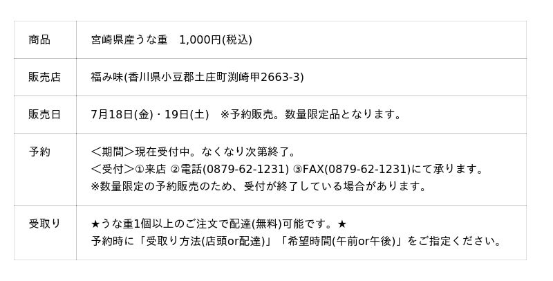 小豆島の弁当・惣菜店『福み味』、宮崎県産うなぎを使用した「うな重」を1,000円(税込)で販売