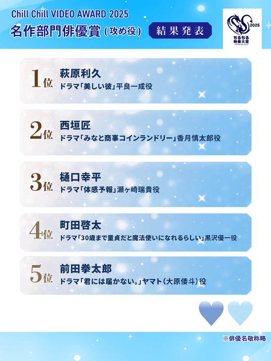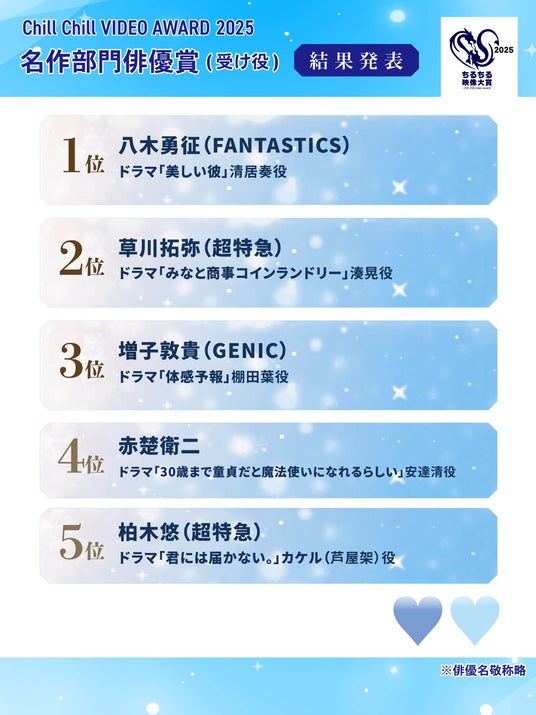また、本作の主演を務めた平良一成役・萩原利久さんは名作部門俳優賞(攻め役)、清居奏役・八木勇征さん(FANTASTICS)は名作部門俳優賞(受け役)で、それぞれ1位を受賞。高い表現力で透明感のある世界観を演出し、多くの視聴者を虜にしました。