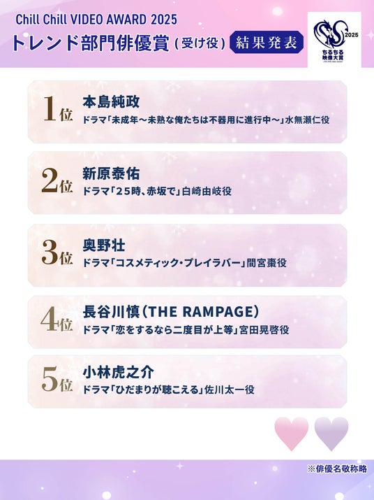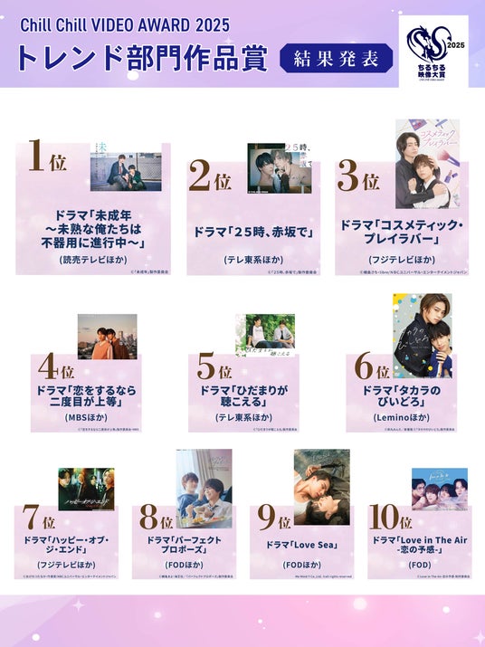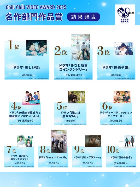 2025年7月4日(金)、当社が運営するBL情報サイト「ちるちる」(https://www.chil-chil.net/)にて、今年初開催となる実写BL作品の総選挙「ちるちる映像大賞2025」の結果を発表いたしました。