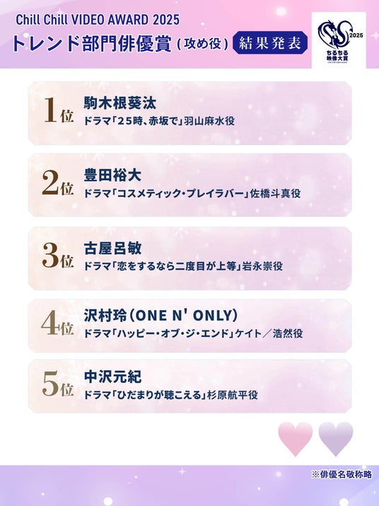 トレンド部門俳優賞(攻め役)では、華やかかつ繊細な演技で視聴者の心を揺さぶったドラマ「25時、赤坂で」の羽山麻水役・駒木根葵汰さんが1位に。高い表現力が放送終了後も話題を呼び、今なお国内外で根強い支持を獲得しています。