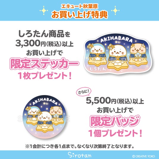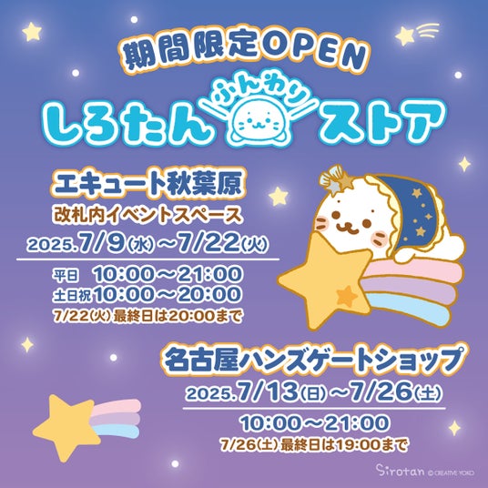 この度開催するエキュート秋葉原、名古屋ハンズゲートショップでのポップアップストアでは、"夢と希望のお星さま"をテーマに、『しろたん』ならではのいつでもそっと寄り添ってくれるふわふわなやさしさと、きらきらしたファンタジーが広がる世界観を表現します。全国8拠点限定販売の"ご当地しろたん"アイテムが一堂に集結するほか、"夢と希望のお星さま"を表現したマスコット・キーホルダーなど、『しろたん』取扱店舗で開催する誕生日フェア記念商品もラインアップします。海の日や夏休みを目前に控え、お出かけ気分が高まるこの時期、家族で楽しめるスポットとしてもぴったりです。皆さまのご来場をお待ちしております。