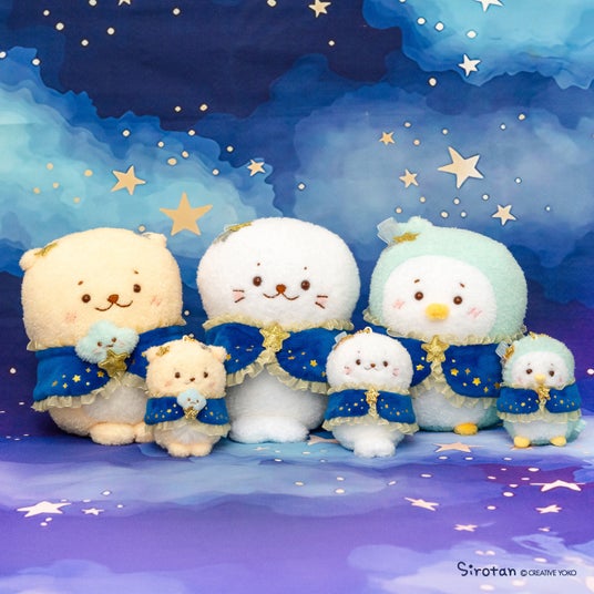 上段 : 星ケープマスコット しろたん(中央)、らっこいぬ(左)、らむね(右) 各3,300円(税込) 下段 : 星ケープキーホルダー しろたん(中央)、らっこいぬ(左)、らむね(右) 各1,980円(税込)
