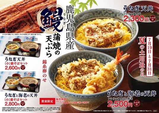 ロイヤルグループが展開する天丼・天ぷら専門店「天丼てんや」は、土用の丑の日に合わせた限定メニューとして、鹿児島県産うなぎの蒲焼きを使用した『うなぎと海老の天丼』と『うなぎ天丼』を2025年7月18日(金)より計8,200食の数量限定で販売いたします。