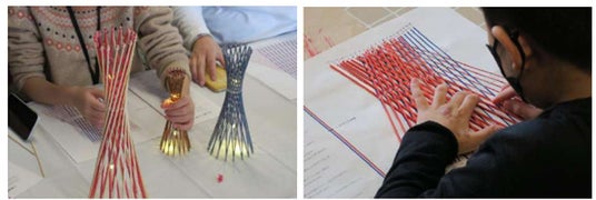 配布されたミニ神戸ポートタワーの材料(竹ひご、シリコンチューブ、バルーンライト)を使って、ミニチュアの神戸ポートタワーを設計・制作します。デザインのポイントや作り方も丁寧に説明し、スタッフが親子での制作をしっかりサポートします。