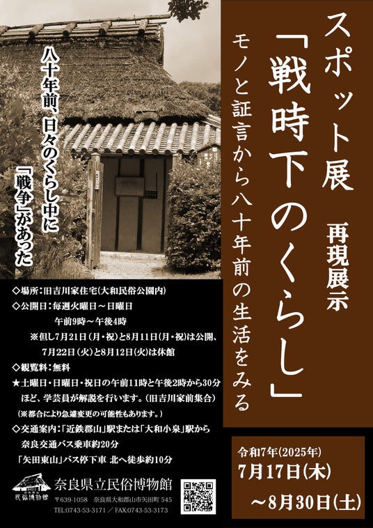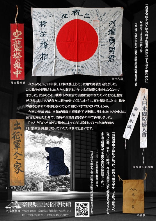 奈良県立民俗博物館では、7月17日(木)から8月30日(土)まで、スポット展「戦時下のくらし-モノと証言から80年前の生活をみる-」を開催します。