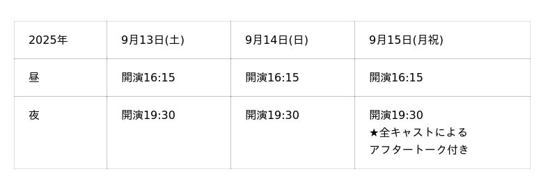 ・昼公演と夜公演では照明他の演出に違いがございます。ご了承の上チケットをご購入ください。