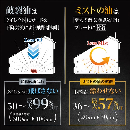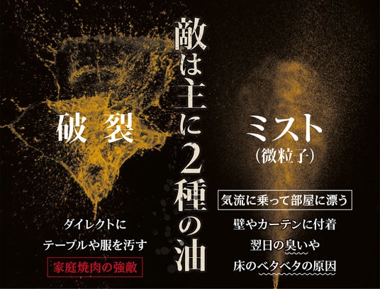 焼肉の油はね、実はミストが天井まで飛んでいる?焼肉を楽しんだ後に「床や壁がベタベタ…」といった経験はありませんか?実は、目に見える"破裂油"だけでなく、ミスト状の見えない油が上昇気流に乗って広範囲に拡散しています。