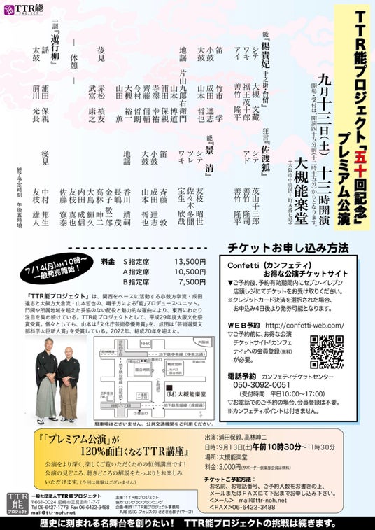 一般社団法人TTR能プロジェクト主催、TTR能プロジェクト「50回記念」プレミアム公演『楊貴妃・景清』が2025年9月13日(土)に大槻能楽堂(大阪府大阪市中央区上町A7)にて上演されます。