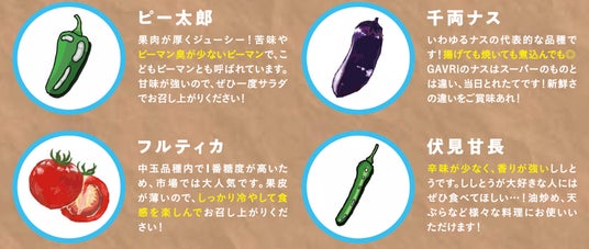 ピー太郎(ピーマン)、千両ナス、フルティカ(トマト)、伏見甘長(シシトウ)