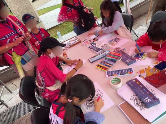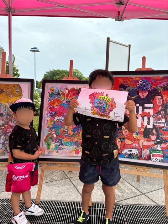 セレッソ大阪をテーマにMUSASHIが描いた作品を寄贈させていただき、その後大阪府警と合わせた三社で防犯啓発ポスターを制作、出展ブースで作品展やMUSASHIぬり絵コーナーを出展させていただいた流れから、今回の万博出展にもご協力をいただくことになった。