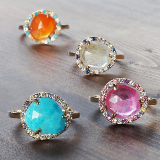 今回は特別に、20種以上のカラーストーンをご用意。クラシカルにダイヤモンドで取り巻くもよし、カラーストーン同士を組み合わせて遊ぶもよし。ゆるやかな余白を残した取り巻きが、モダンで軽やかな印象を引き出してくれます。