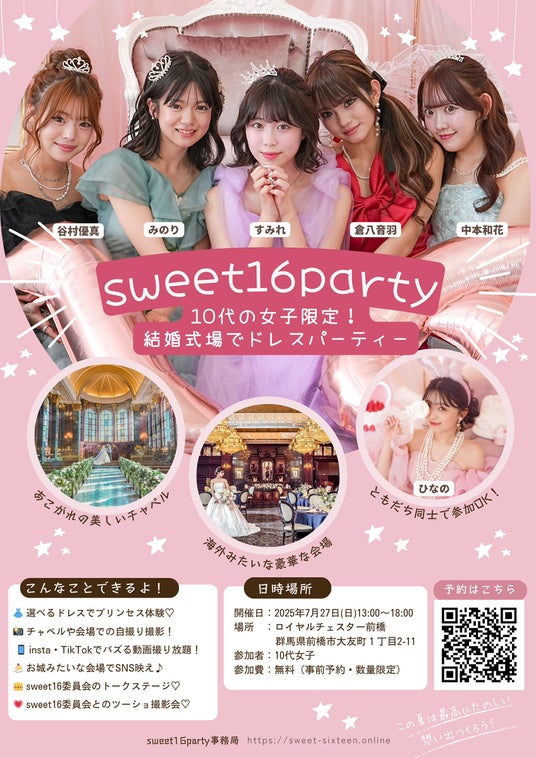 いま女子中高生に人気のインフルエンサーチーム「sweet16委員会」が主催するパーティーイベント「sweet16party」が、この夏、前橋市の結婚式場「ロイヤルチェスター前橋」で開催されます。