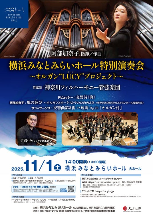 横浜みなとみらいホールが主催する「阿部加奈子 指揮/作曲 横浜みなとみらいホール特別演奏会 ~オルガン"LUCY"プロジェクト~」(2025年11月1日開催)、「第43回横浜市招待国際ピアノ演奏会」(2025年11月16日開催)の2公演が、「文化庁|劇場・音楽堂等における子供舞台芸術鑑賞体験支援事業」の対象となりました。