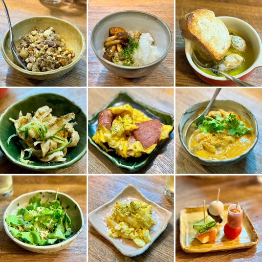 料理はすべてお一人様向け。旬の食材を使った日替わりの小皿料理を常時20種類以上提供しています。特に、旬の野菜を使った「野菜呑み」は女性客に人気のスタイルです。