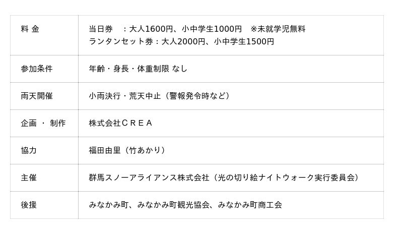 光の切り絵作家・酒井敦美さんが手がける幻想的な幻灯空間に、作曲家でミュージカルソー奏者・サキタハヂメさんが、みなかみの自然から生まれた「動物たちの声」「水のせせらぎ」「風の音」などを取り入れて特別に作曲した音楽が融合。まるで自然と一体となったような、幻想的な夜の散歩が楽しめます。
