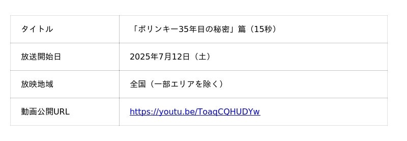株式会社湖池屋(社長:佐藤章)は、1990年の発売以来ロングセラーを誇るコーンスナック「ポリンキー」の発売35周年を記念し、初代TVCM「ポリンキーの秘密」を"完全再現"した新TVCM「ポリンキー35年目の秘密」篇(15秒)を制作。2025年7月12日(土)より、全国(一部エリアを除く)にて順次放送を開始いたします。 また、これに合わせて新商品「カリッカリえびポリンキー えび塩」を2025年7月7日(月)より全国のコンビニエンスストアにて先行発売、2025年7月14日(月)より全国のスーパーマーケット他一般チャンネルにて発売します。