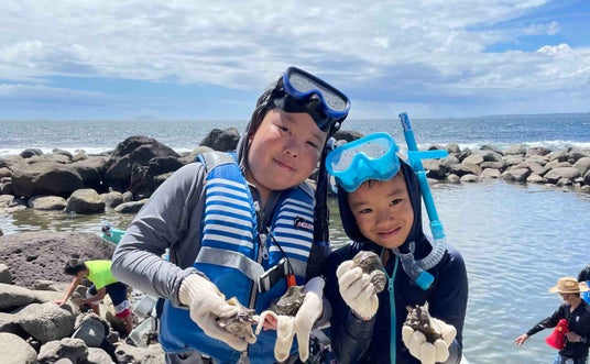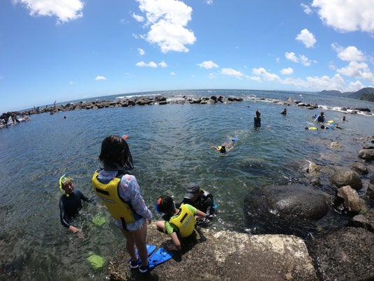 砂浜ではなく岩場の海水浴場なので、スノーケリングを楽しみながら色とりどりの魚を観察したり、岩陰に潜むカニやエビを捕まえたりと、自然とのふれあいが満載。まるで海の生き物探検隊になった気分で、子どもたちの好奇心をくすぐります。