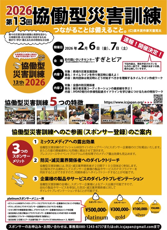 2014年国土交通省「広域的地域間共助推進事業」としてスタートし、「これまでの震災の経験と教訓を、来るべき大規模災害に活かすこと」をモットーに毎年開催を重ねている一般社団法人協働型災害訓練(本社:埼玉県東松山市、代表理事:とよしま亮介)は、本年度も「つながることは備えること」のキャッチコピーの元、第13回協働型災害訓練in杉戸を2026年2月6日~7日に開催することを決定しました。