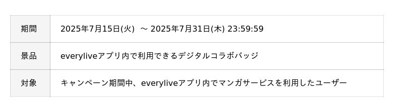 ライブ配信アプリ「everylive(エブリライブ)」にて、2025年7月15日(火)からマンガが1巻無料配信されます。同時開催される利用ユーザーキャンペーンもお見逃しなく。