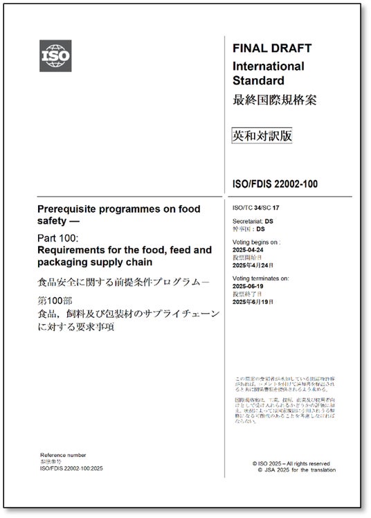 一般財団法人日本規格協会(本部:東京都港区、理事長:朝日弘)は、2025年7月1(火)にISO/FDIS 22002-1:2025食品安全に関する前提条件プログラム-第1部:食品製造とISO/FDIS 22002-100:2025食品安全に関する前提条件プログラム-第100部:食品, 飼料及び包装材のサプライチェーンに対する要求事項の邦訳(英・日対訳版)を発行いたしました。