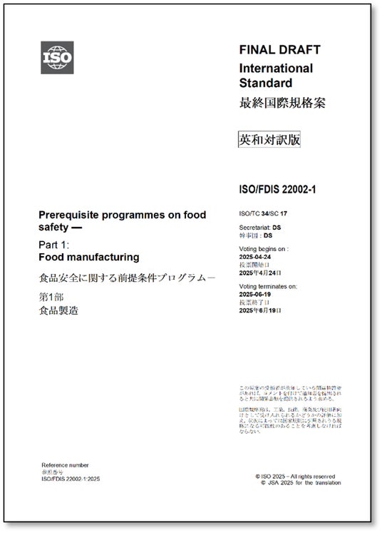 ISO/FDIS 22002-1:2025 食品安全に関する前提条件プログラム-第1部:食品製造 Prerequisite programmes on food safety - Part 1: Food manufacturingこの文書はFDIS(最終国際規格案)であり、審議途中の文書です。