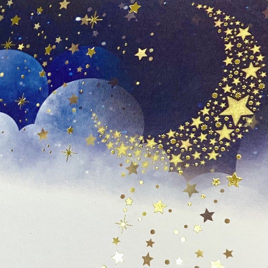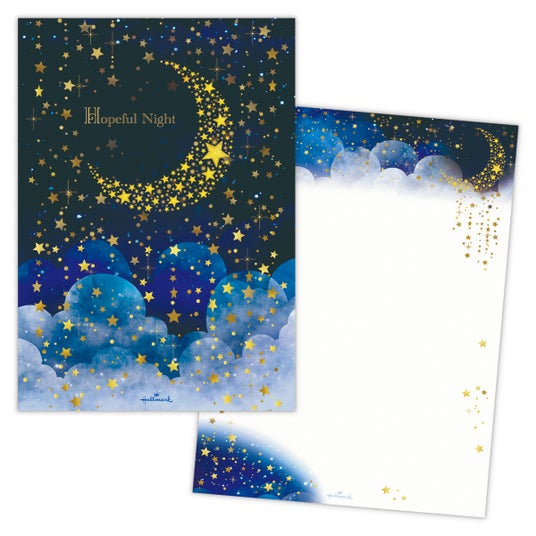 お手紙だけでなくイラストを添えるなど幅広く"書くこと"を楽しんでいただけるよう、洋柄レターに珍しい罫線なしタイプを開発。輝く三日月が星を降らせ、美しい夜空をつくり出す様子が描かれています。ブルーの濃淡で表現された奥行きある空に金箔加工の月や星が映えます。