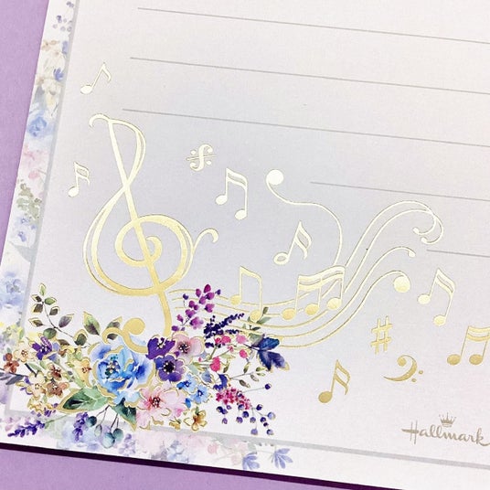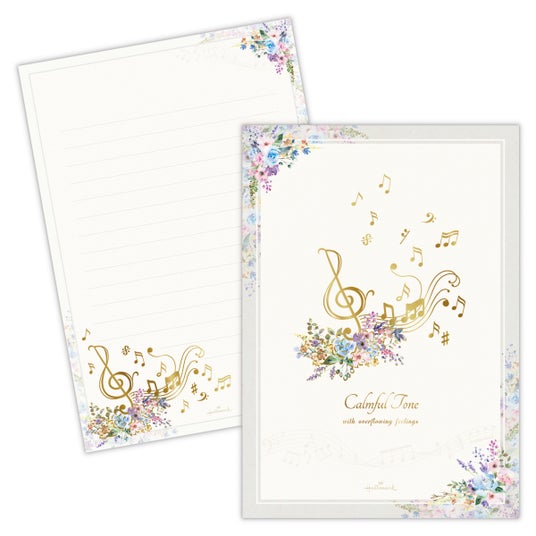 ファンレター用としても需要が高い音楽柄は、同じく定番人気の花を組み合わせて上品に。特定の楽器ではなく五線譜と音符のモチーフを描くことで、幅広い音楽好きの方に楽しんでいただけるようにしました。落ち着いたグレイッシュトーンに、マットタイプの金箔加工がシックで繊細な印象を与えます。