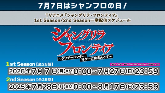 3rd Seasonの制作が決定したTV アニメ『シャングリラ・フロンティア』。毎年7月7日は「シャンフロの日」として多くの発表をしてきました。そこで今年の「シャンフロの日」を記念して、講談社が運営する YouTube チャンネル『フル☆アニメ TV』にて、TV アニメ『シャングリラ・フロンティア』1st Season、2nd Season全50話を期間限定で段階無料配信いたします。1st Seasonは7月7日から7月27日まで、2nd Seasonは7月28日から8月17日まで公開となります。ぜひお楽しみください。